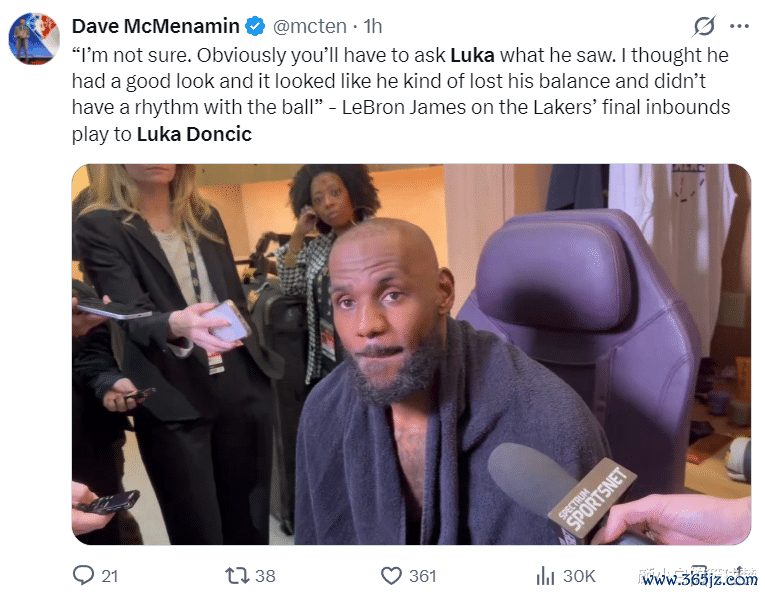 詹姆斯赛后也表示,东契奇应该投那是一个空位,传给我时有点失去平衡了。