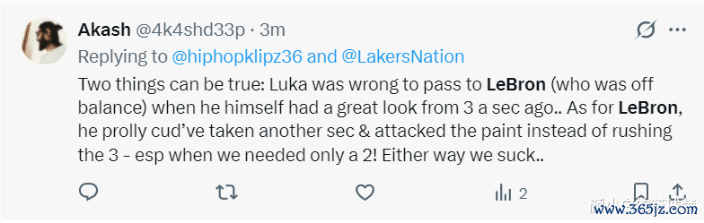 湖蜜:东契奇拒投绝杀传给给勒布朗就是错,他明明有一个绝佳的空位三分机会而勒布朗明显已经失去平衡。但是詹姆斯也有错,他接球后甚至还能有超过一秒钟的突破内线时间,我们只需要一个两分球就可以赢得比赛不需要去强投三分。