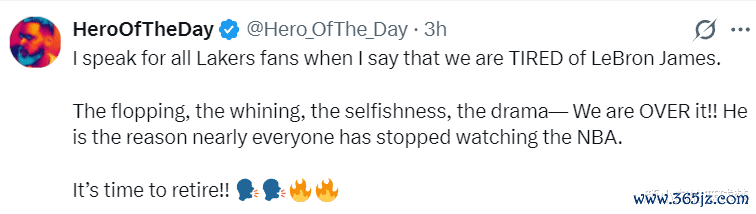 詹黑媒体HOTD写道:我代表所有的湖人球迷发表这番言论时,我对勒布朗-詹姆斯已经感到厌倦了。那些抱怨、嗷嚎、自私、闹剧的场面我们已经受够了,他就是导致现在的人都不喜欢看NBA的关键,他是时候该退役了。