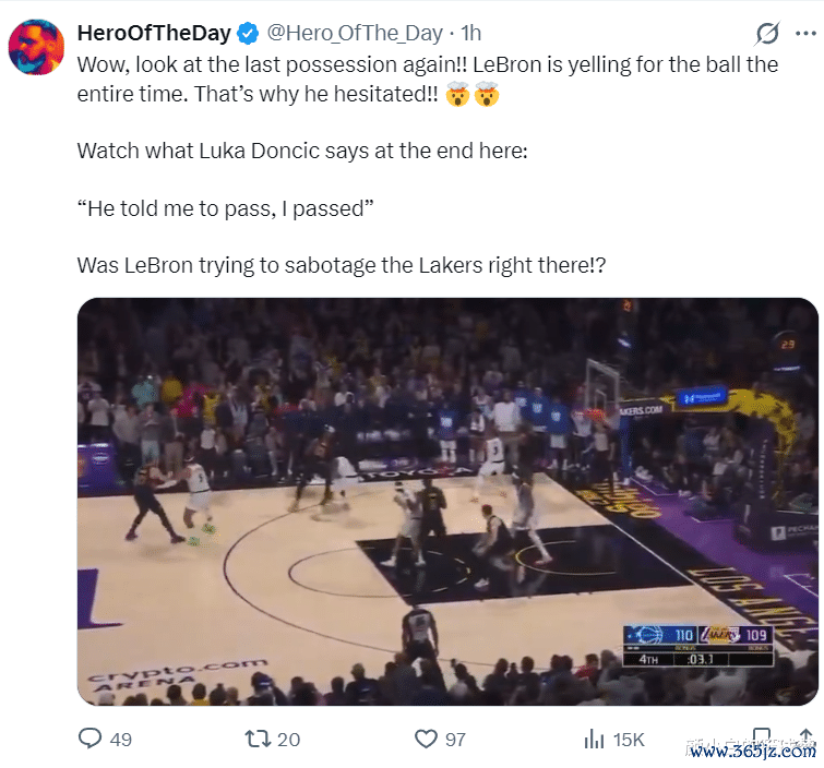 詹黑媒体HOTD晒出詹姆斯丢绝杀的瞬间写道:哇,再看看最后那个画面吧,詹姆斯正常比赛都在抢球权,这就是他犹豫不决的原因。勒布朗在场时故意破坏湖人的局势。(詹黑媒体果然是欲加之罪何患无辞)