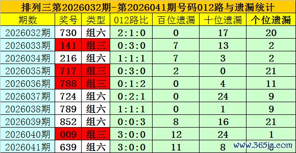 开奖回顾:排列三第2026041期奖号为:639,类型为组六,号码012路比为3:0:0,百十个位号码直选分别遗漏11期、8期和0期。